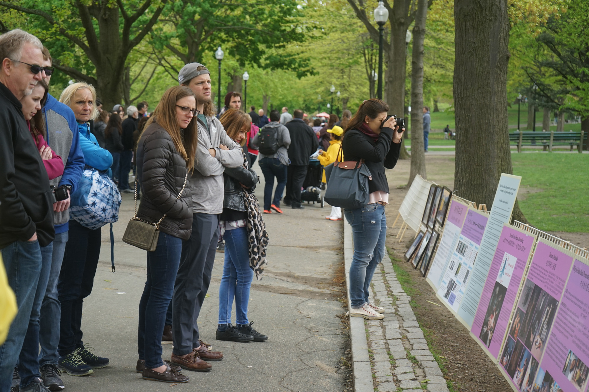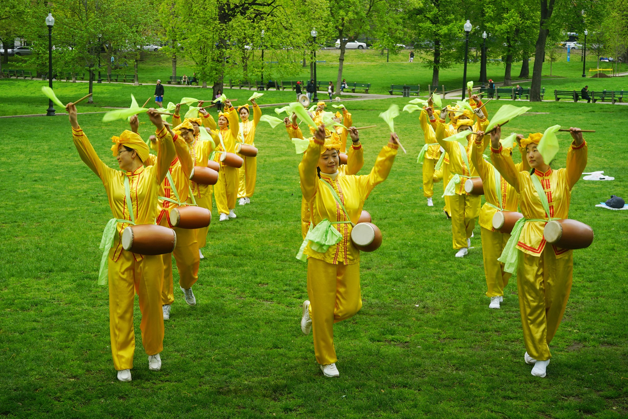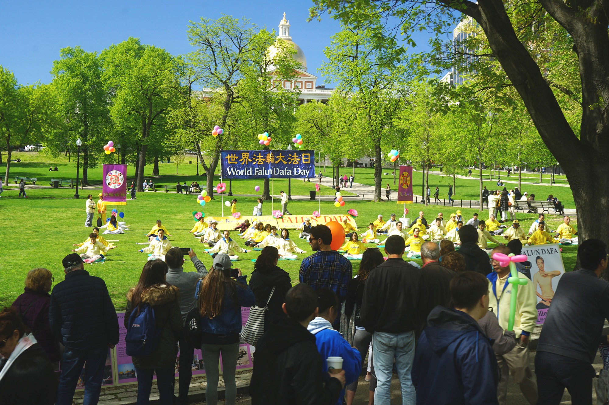 【明慧网二零一八年五月十五日】(明慧记者程德美国波士顿报导)二零一八年五月十三日,是法轮大法开传二十六周年,第十九届“世界法轮大法日”暨法轮大法创始人李洪志先生六十七华诞。美国波士顿法轮功学员于五月十三日在波士顿公园以集体炼功、腰鼓表演、唱谢师恩,把大法的美好展现给世人;同时利用讲真相方式来庆祝“世界法轮大法日”暨恭贺师尊华诞。