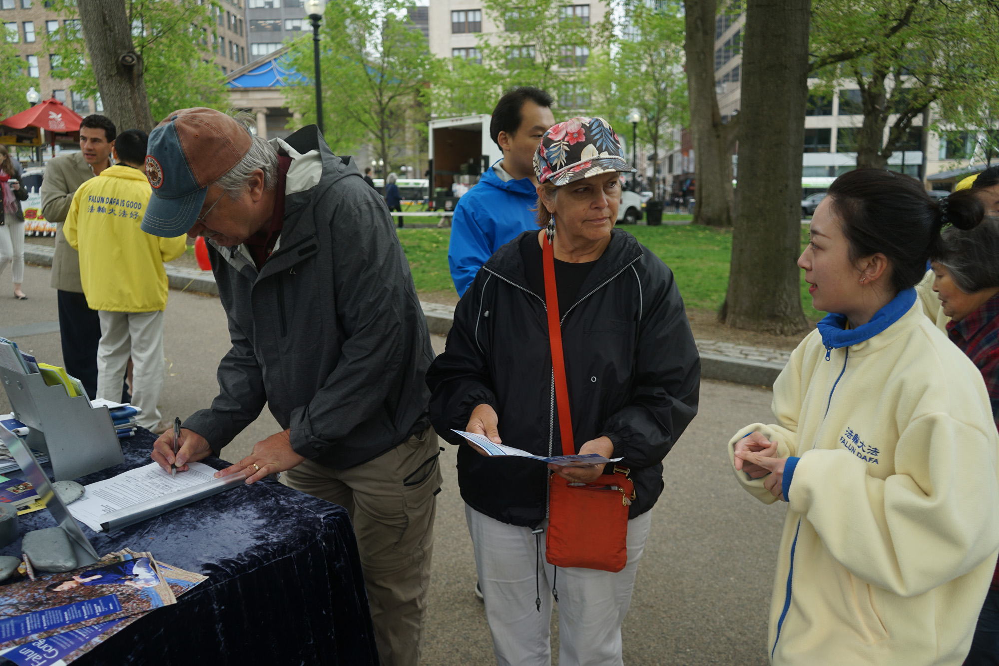 一位拄拐杖的男士感受到学员们的场能量大且正,赞叹说:“你们的能量强大的不可思议!”一位家住Wayland的女士听完真相后很感动,主动表示要和她的议员联络,支持反迫害。