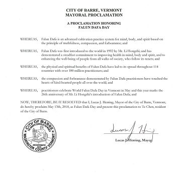 鉴此,我,卢卡斯·何瑞,巴尔市长宣布二零一八年五月十三日为佛蒙特州巴尔市的“法轮大法日”。