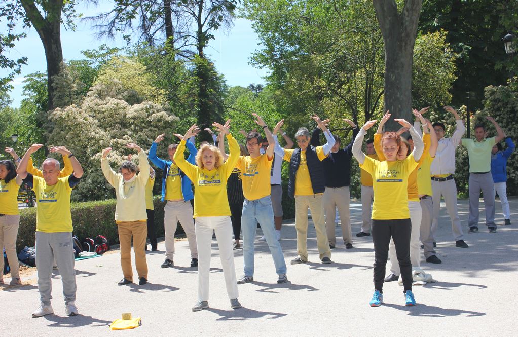 '图1:法轮功学员在马德里丽池皇家公园欢庆世界法轮大法日,恭祝慈悲伟大的师尊生日快乐'