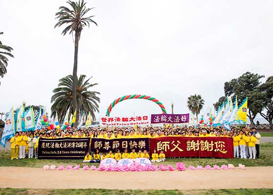 五月十三日,洛杉矶部份法轮功学员在圣莫妮卡海滩庆祝5.13“世界法轮大法日”暨法轮大法创始人李洪志先生华诞。