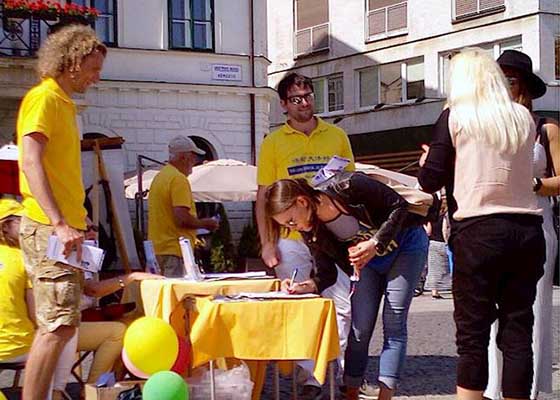 五月十三日,斯洛伐克部份法轮功学员们来到首都布拉迪斯拉发老城区赫维斯多斯拉夫广场,在国家歌剧院的对面举办庆祝世界法轮大法日活动。