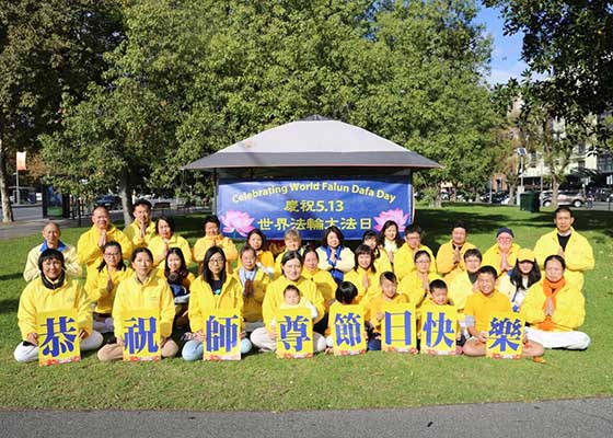 五月十二日,南澳大利亚阿德莱德市的部份法轮功学员一大早汇聚在市中心的欣德玛什广场,以合影、集体炼功、讲真相的等方式庆祝“世界法轮大法日”。