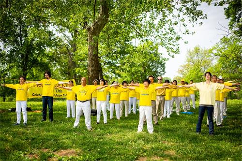 ![]() 图1~2:圣路易法轮功学员在当地著名景点森林公园集体炼功,庆祝法轮大法日。 |