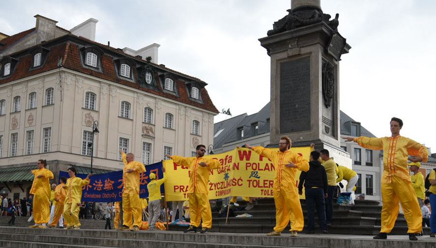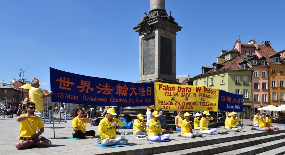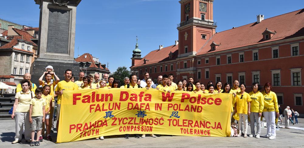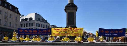 【明慧网二零一八年五月十六日】二零一八五月十三日,波兰法轮功学员欢聚华沙,集体学法并在市中心古城广场举办法轮功五套功法展示、讲真相、征签及舞龙活动,庆祝法轮大法洪传世界二十六周年暨师尊华诞。站在古城广场上,法轮功学员首先齐声朗诵:“法轮大法好!真善忍好!恭祝师尊生日快乐! 并在祥和的音乐中开始法轮功五套功法展示。