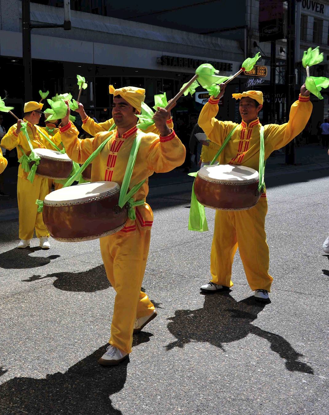 集会结束后,法轮功学员沿着市中心繁华大道游行约1小时,经过温哥华著名景点五帆酒店,温哥华冬奥火炬等景点。游行所过之处吸引了大批观众,有的用手机拍摄游行场面,有的接受了法轮大法真相资料后就地阅读,其中不少是华人观众。很多民众在车内,公共汽车内,路边窗户后面向游行的法轮功学员挥手致意。