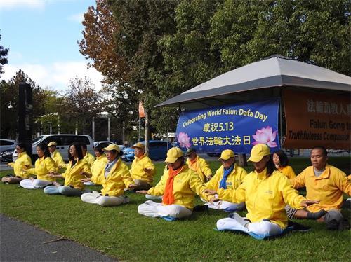 每年的五月十三日是世界法轮大法日,今年是法轮大法洪传世间的26周年。南半球初冬的早晨,阳光灿烂,蓝天碧草,悬挂着的彩色横幅和穿着金黄色炼功服学员们炼功的祥和场面,在车水马龙的市区构成一道亮丽的风景线。过往车辆鸣笛致敬,行人驻足关注。