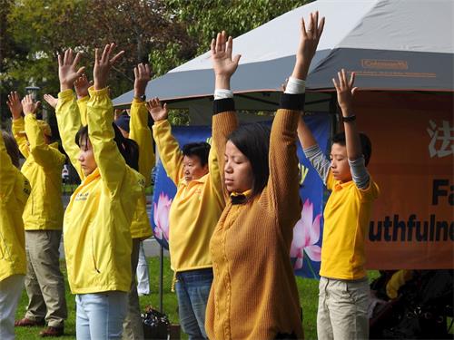十点半左右,学员们开始在广场上集体炼功,展示法轮功的五套功法。乐音悠扬,场面祥和美好。许多路人或凝神观望,或面带微笑走过,并向法轮功学员们竖起了大拇指。