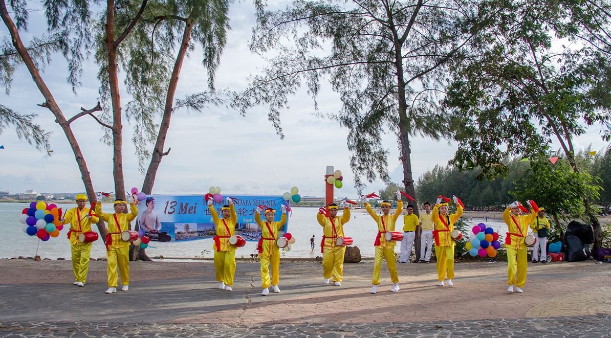 '图1:巴淡岛法轮功学员在奥卡里纳(Ocarina)游乐场庆祝世界法轮大法日。'