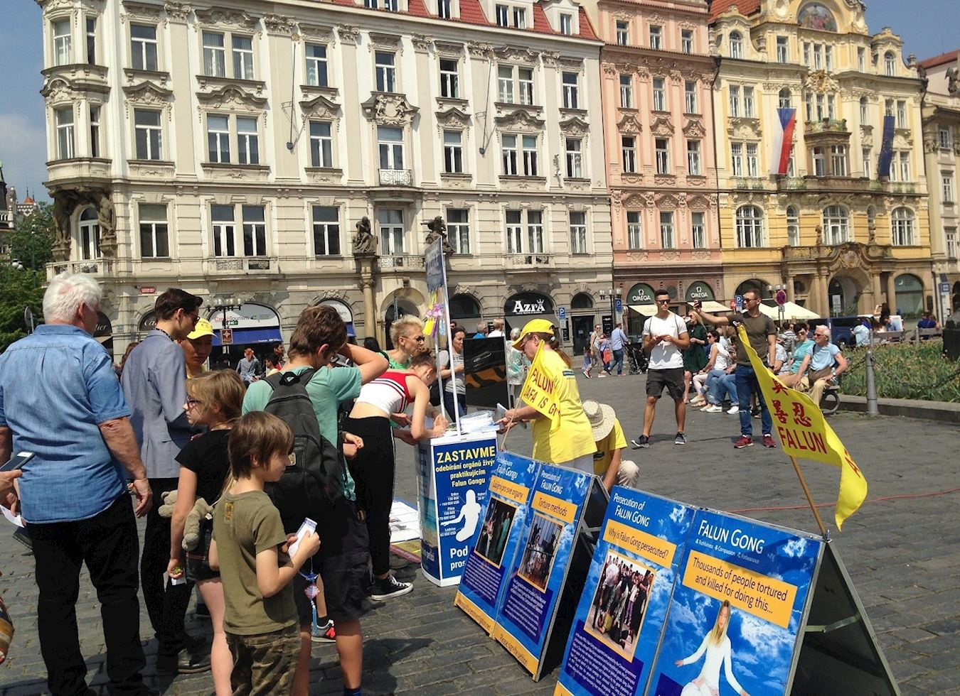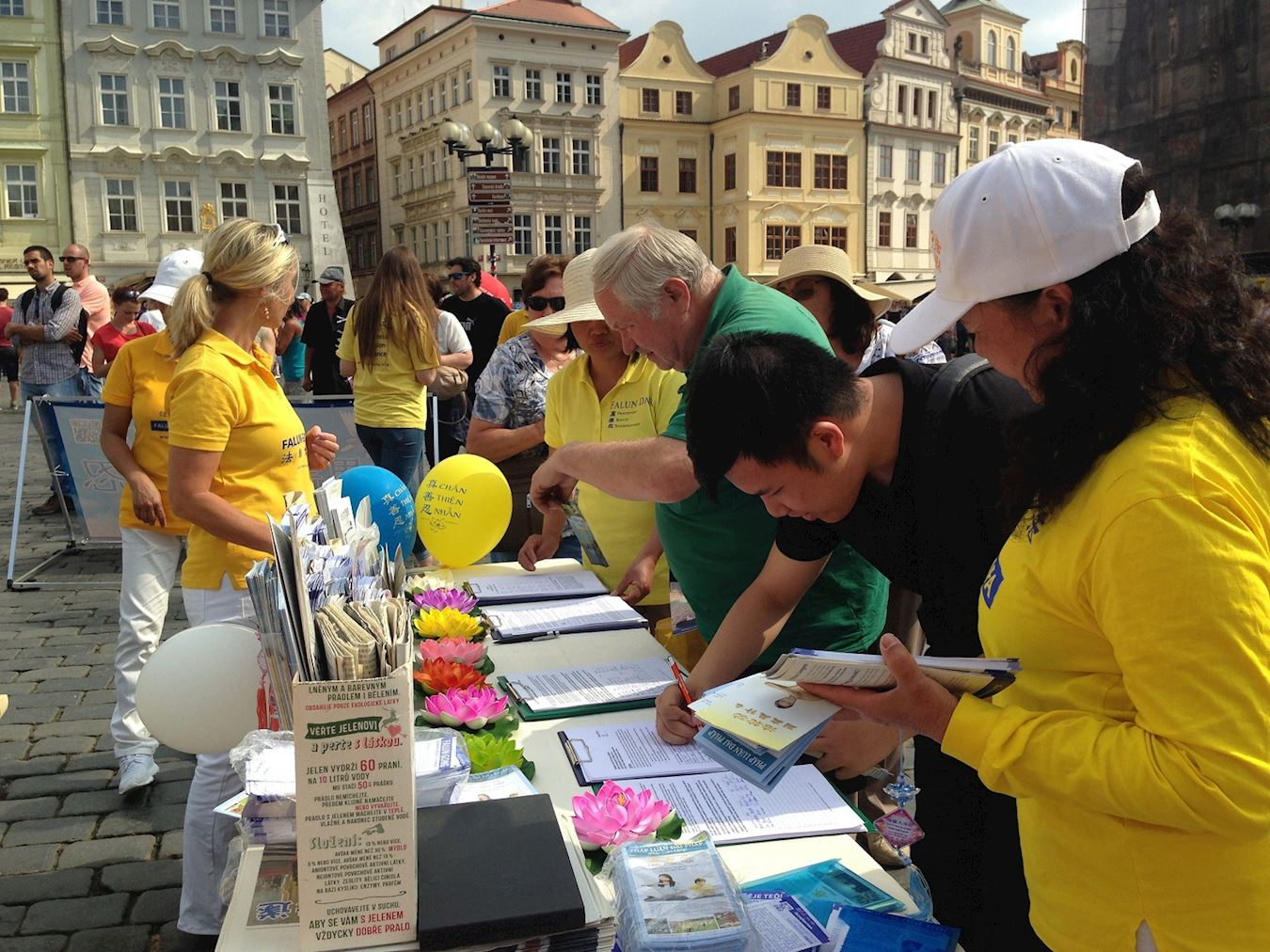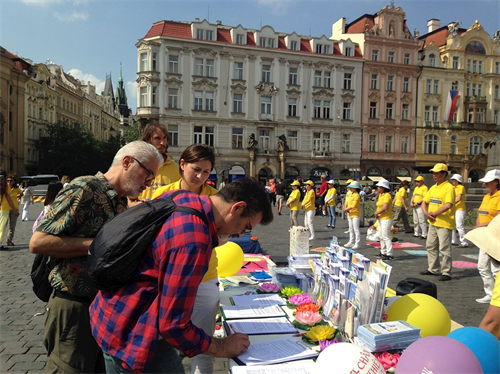 五月十二日星期六,捷克法轮功学员聚集在布拉格老城广场(Staroměstské náměstí),组织各种活动庆祝世界法轮大法日,传递法轮大法“真、善、忍”的美好,并揭露中共残酷迫害法轮功的罪行。在老城广场上设有“支持法轮功反迫害”的征签簿和揭露中共活摘法轮功学员器官的演示台。学员们集体炼功展示祥和优美的功法,并散发多种文字的真相资料告诉人们,法轮功在全世界已经弘传到一百多个国家和地区,福泽全人类。法轮功修炼使亿万人获得身心健康,给家庭给社会带来幸福和谐;同时揭露中共残酷迫害法轮功及活摘学员器官的罪行。活动现场气氛热烈,吸引了众多民众停留观看。他们纷纷签名,支持法轮功学员反迫害。