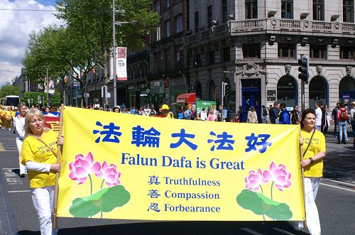 ![]() 图:2~3,法轮功学员在都柏林市中心游行,庆祝法轮大法日。 |