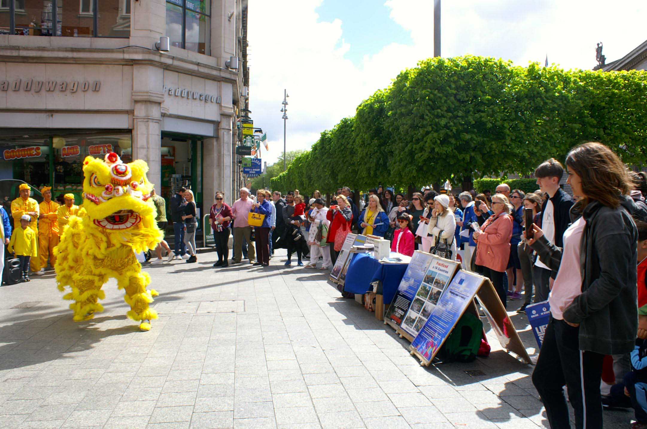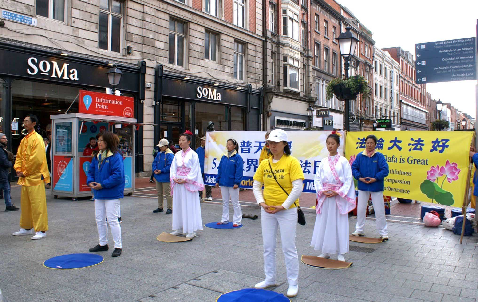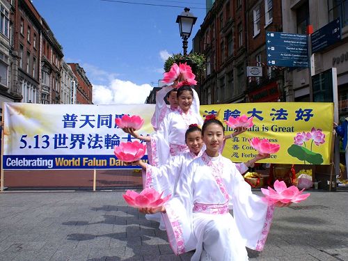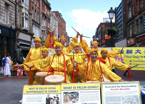游行结束后,法轮功学员在都柏林的地标邮电总局(GPO)附近的广场举行了集会,向众人介绍法轮大法、大法的弘传世界、世界法轮大法日的由来,还有目前在中国遭受的残酷迫害;并演示了法轮功五套优美舒展的功法。同时,为庆祝“世界法轮大法日”,法轮功小弟子们表演了莲花舞、扇子舞、腰鼓、还一起合唱了歌曲“大法小弟子”,男学员表演了唐鼓和狮子舞。