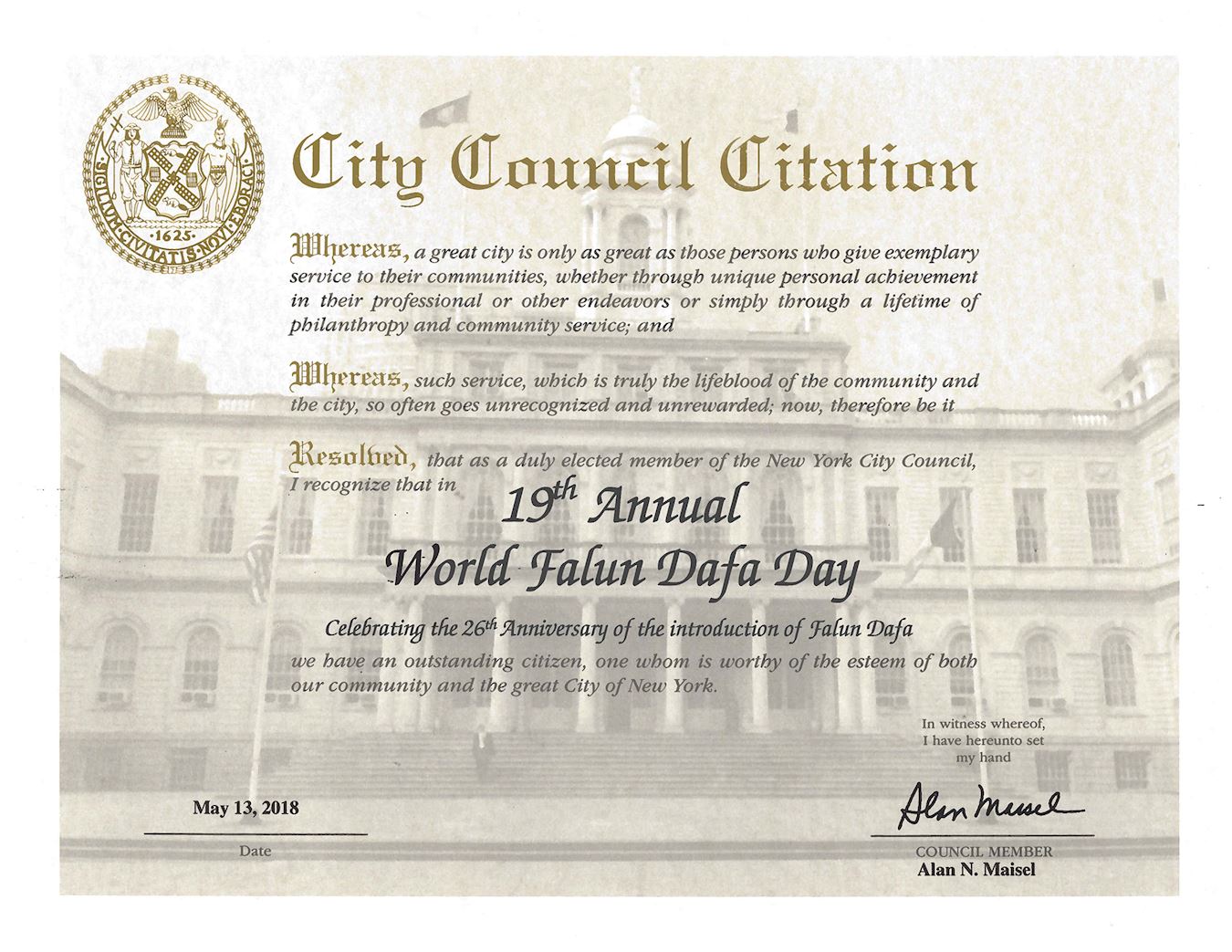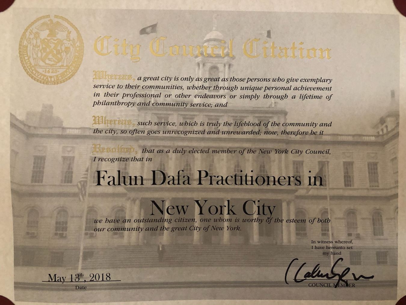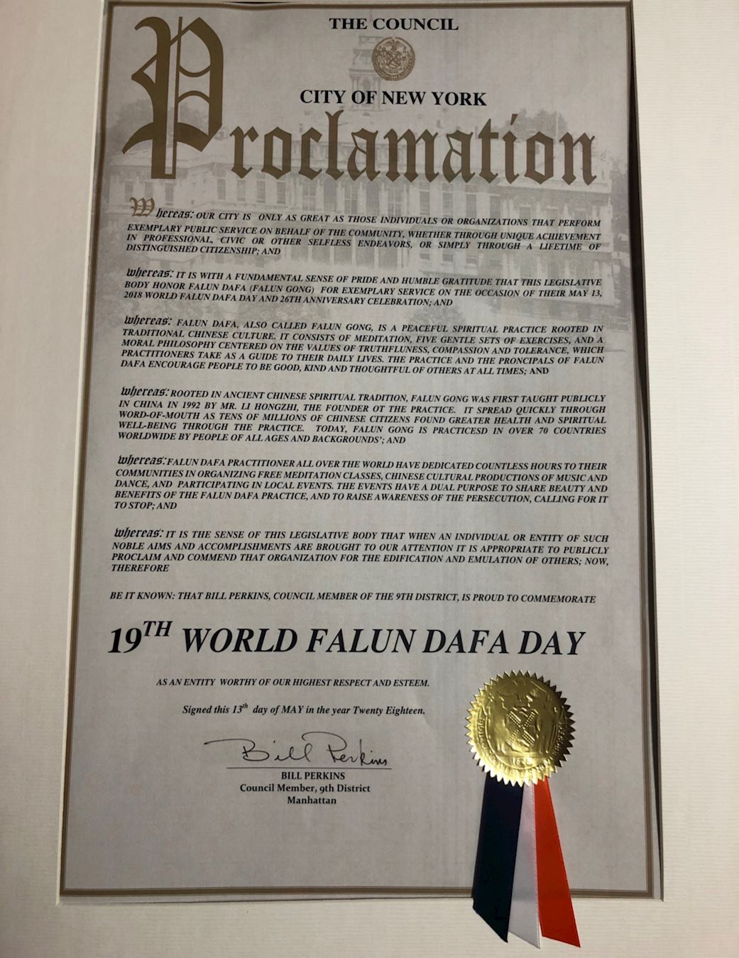 纽约市第九选区市议员比尔·帕金斯(Bill Perkins)授予市议会颁发的褒奖,祝贺第十九届世界法轮大法日·褒奖中写道: