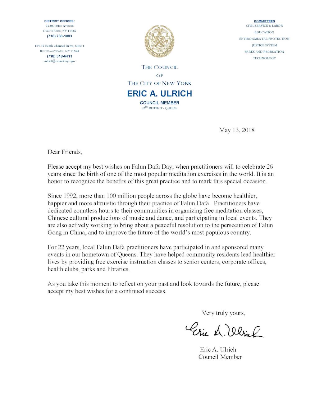 图6:皇后区第三十二选区市议员埃里克·乌尔里希(Eric Ulrich)发来贺信赞扬大法造福人类。