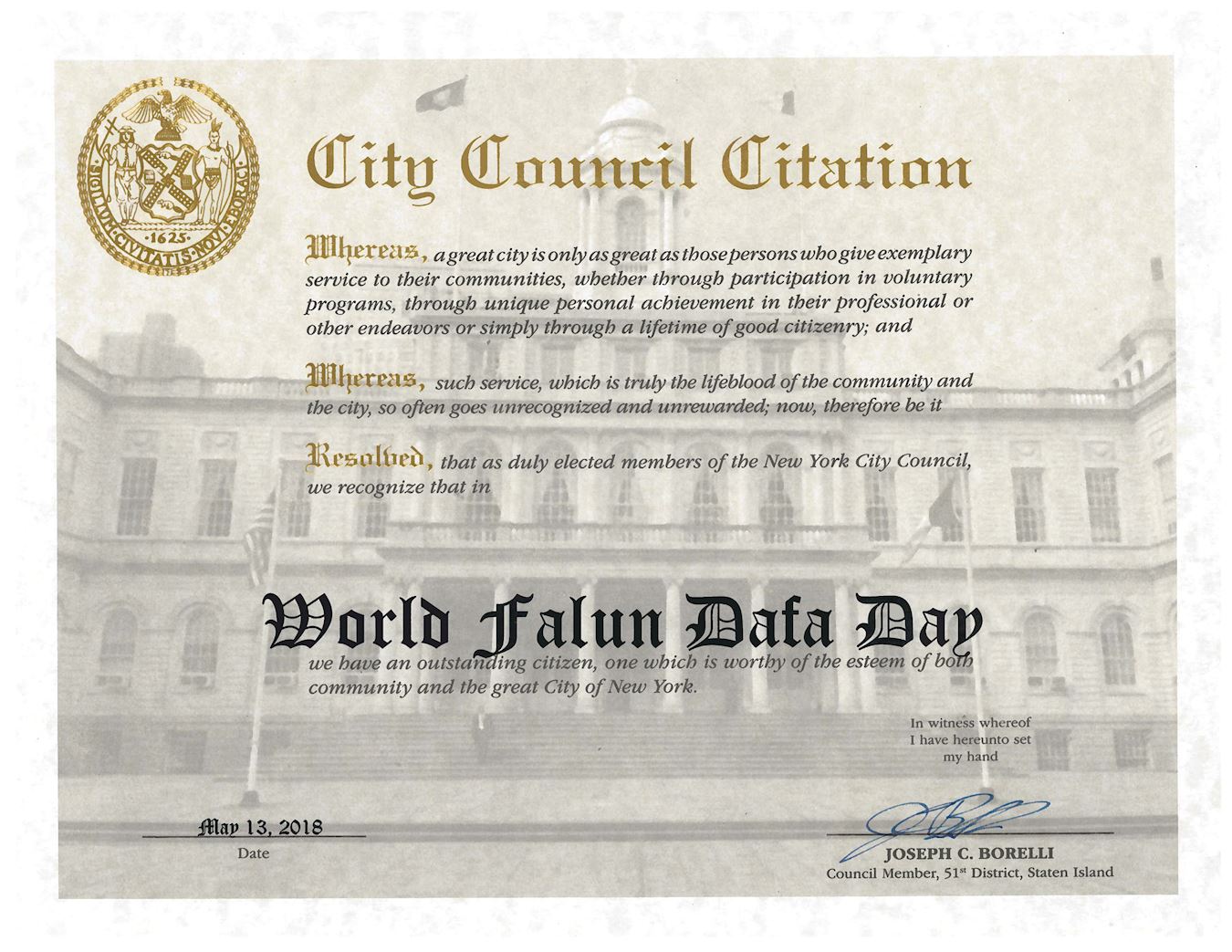 图11:史坦顿岛第五十一选区市议员约瑟夫·博雷利(Joseph Borelli)褒奖世界法轮大法日。