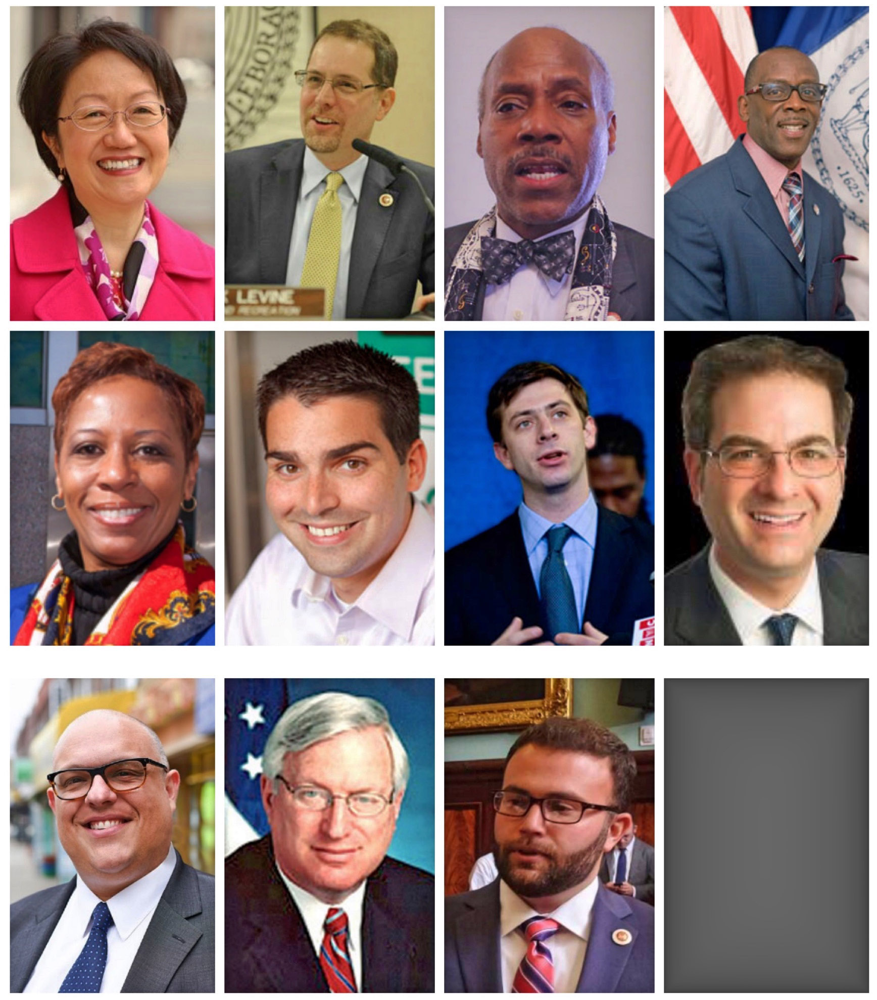 图: 美国纽约市十一位市议员发褒奖贺信,祝贺世界法轮大法日,称颂法轮大法“真、善、忍”原则,赞扬修炼法轮功给纽约人带来健康和福祉。上图排序,从左至右,从上至下: 陈倩雯,马克•莱文(Mark Levin) , 比尔·帕金斯(Bill Perkins),丹尼克•米勒(I. Daneek Miller),阿德里安娜·亚当斯(Adrienne Adams),埃里克•乌尔里希(Eric Ulrich),史蒂芬·莱文(Stephen T. Levin),贾斯汀·布兰南(Justin Brannan),卡尔曼·易伽(Kalman Yeger),阿兰•梅塞尔(Alan Maisel),约瑟夫•博雷利(Joseph Borelli)。