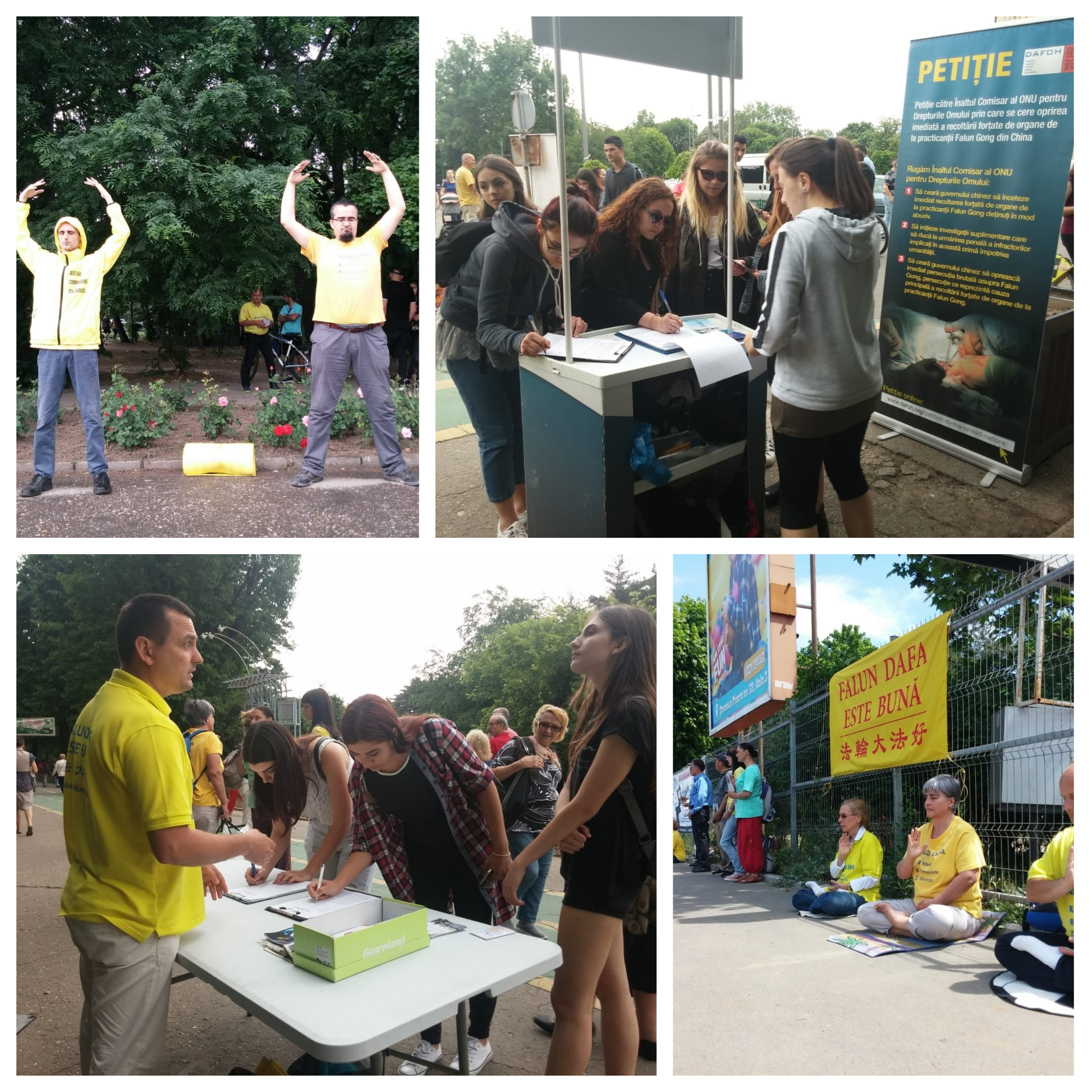 连续两天学员们都聚集在布加勒斯特著名公园Skatepark Her?str?u(该公园毗邻中共驻罗马尼亚大使馆)集体炼功,向民众介绍法轮功功法。很多行人或锻炼者都驻足观看,有的当场在旁边跟着学炼;有的停下脚步拿起真相资料仔细阅读。