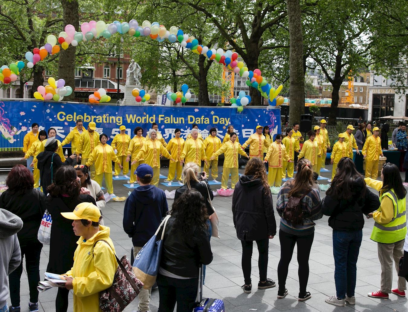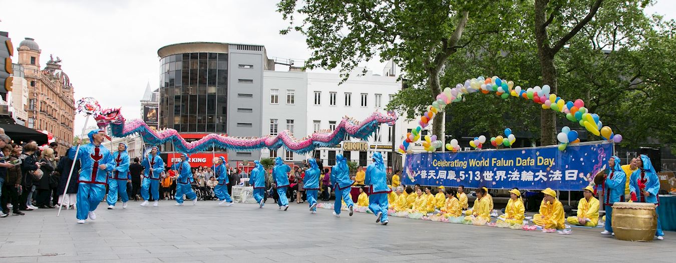 ![]() 图1:五月十三日,英国法轮功学员在伦敦唐人街旁的莱斯特广场庆祝“世界法轮大法日”,表达对李洪志师父的感激。 |