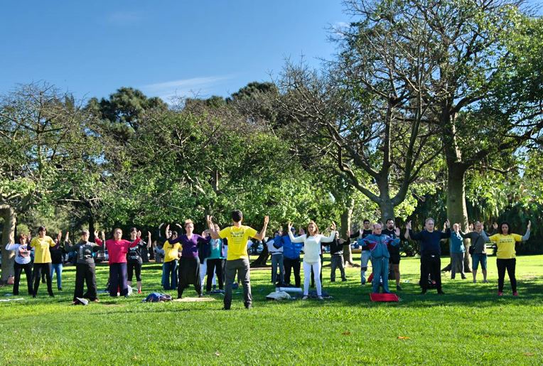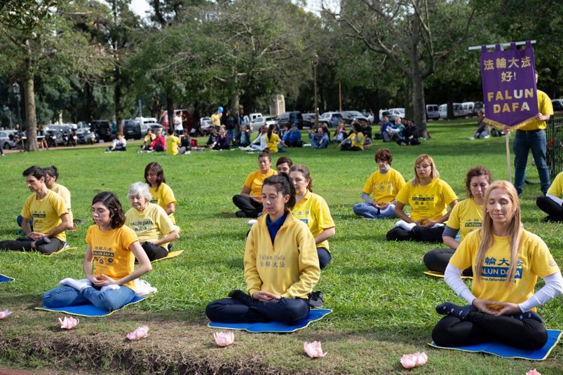 '图2:阿根廷的法轮功学员分别在巴勒莫公园集体炼功,展示大法的美好。'