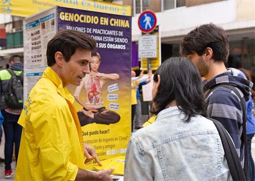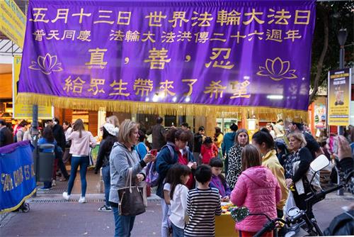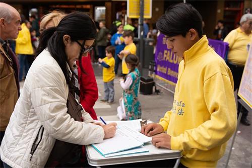 当天是星期六,华人街车水马龙,不少民众停下脚步与学员攀谈了解真相。当得知中共残酷迫害法轮功学员,甚至活摘法轮功学员器官时,感到震惊,许多人签名支持制止迫害。路上经过的汽车看到学员,有的鸣喇叭表示支持,有的摇下车窗跟学员要真相传单。一名男士告诉学员:你们在中国大使馆前面给过我传单。继续加油!