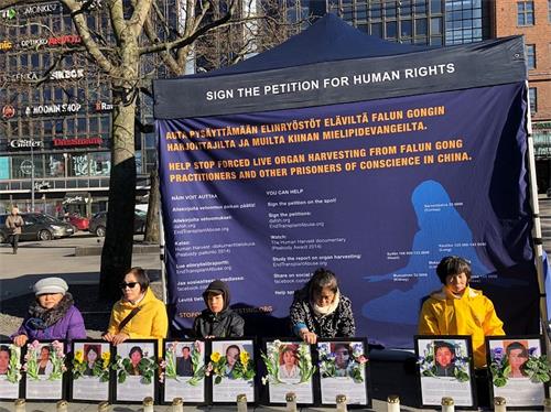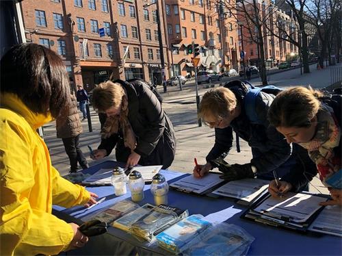 下午在赫尔辛基市中心,芬兰法轮功学员在市中心举行烛光悼念活动。很多路人停下脚步阅读收到的资料,很多人向学员询问更多的关于法轮功还有迫害的事情。因为学员长期在市中心举办活动,很多人已经了解了,就直接过来签名支持停止迫害,有时人们排队签名。