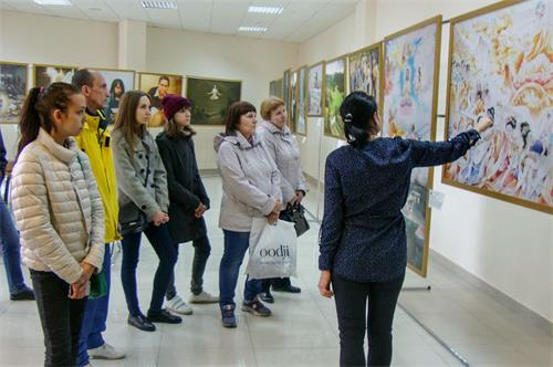 在此地美展不是第一次举行,以前看过美展的人这次带来了自己的亲朋好友和同事来观看。一位来自西伯利亚地区诺里尔斯克市(Norilsk)年轻的运动员对画展深有感触,在留言簿上写道:“为精神的安详致谢。”