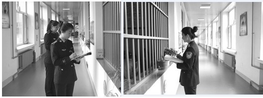新任第二看守所副所长吴艳丽在监室的管理通道中(吴为左前、右侧)