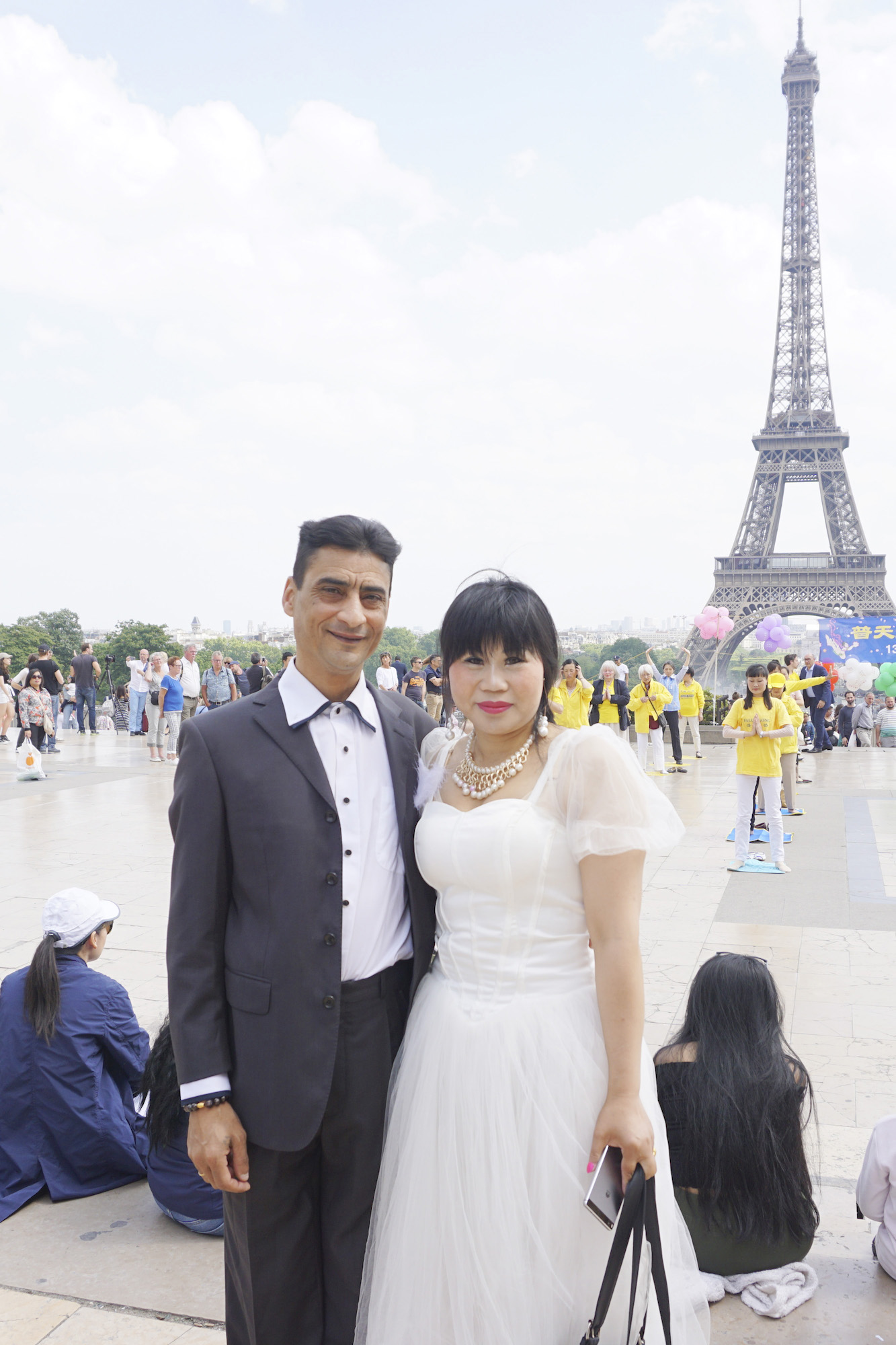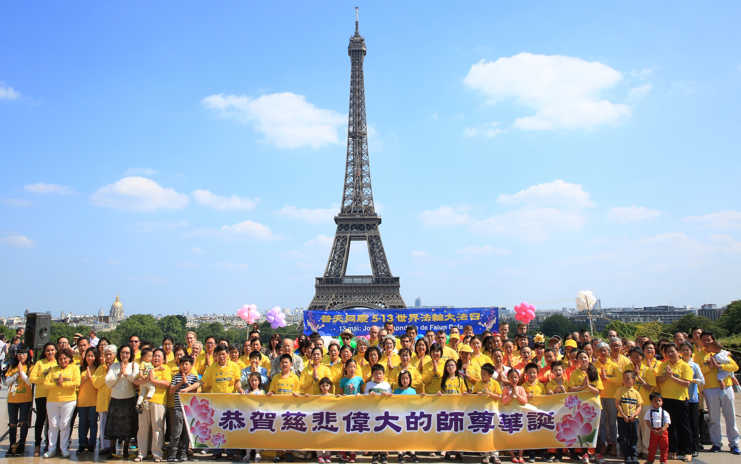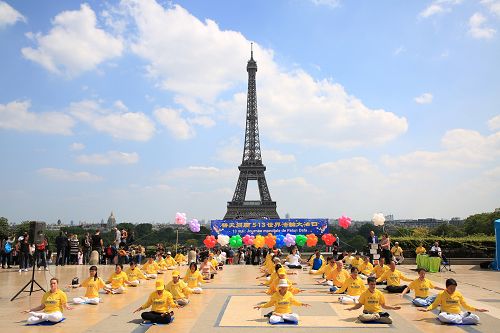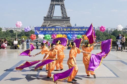 五月二十日在法国巴黎铁塔对面的人权广场上,法国法轮功学员们用歌舞演出和功法演示向过往的游客和法国民众传递大法的美好,同时也告诉人们正在中国发生的对大法修炼者的迫害,呼吁制止迫害。