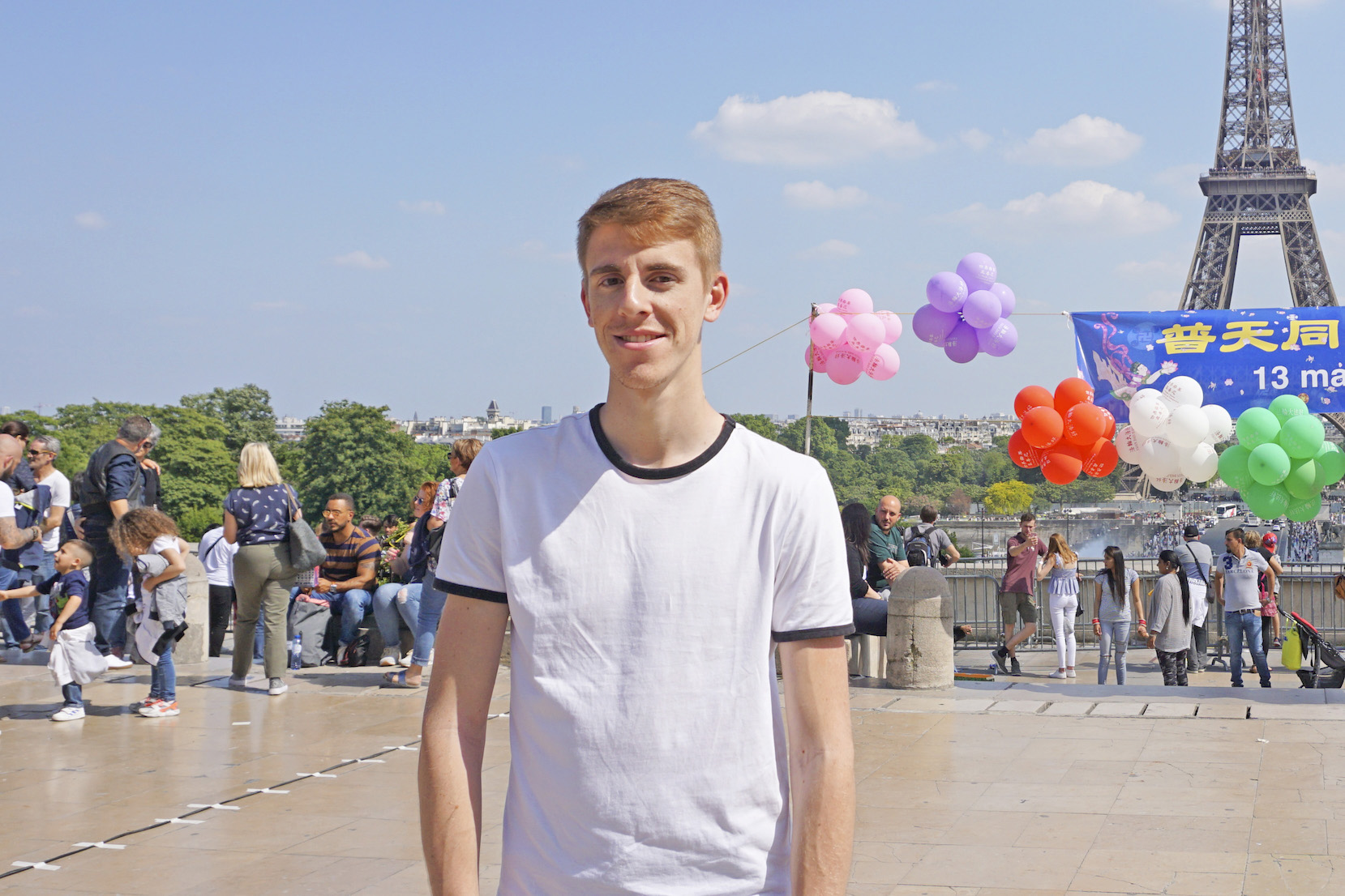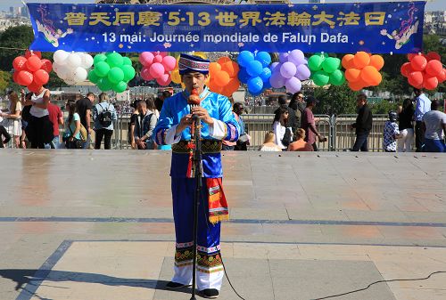 图16:修炼大法三年的中学数学老师冈单(Quentin)在巴黎人权广场参加庆祝世界法轮大法日活动。