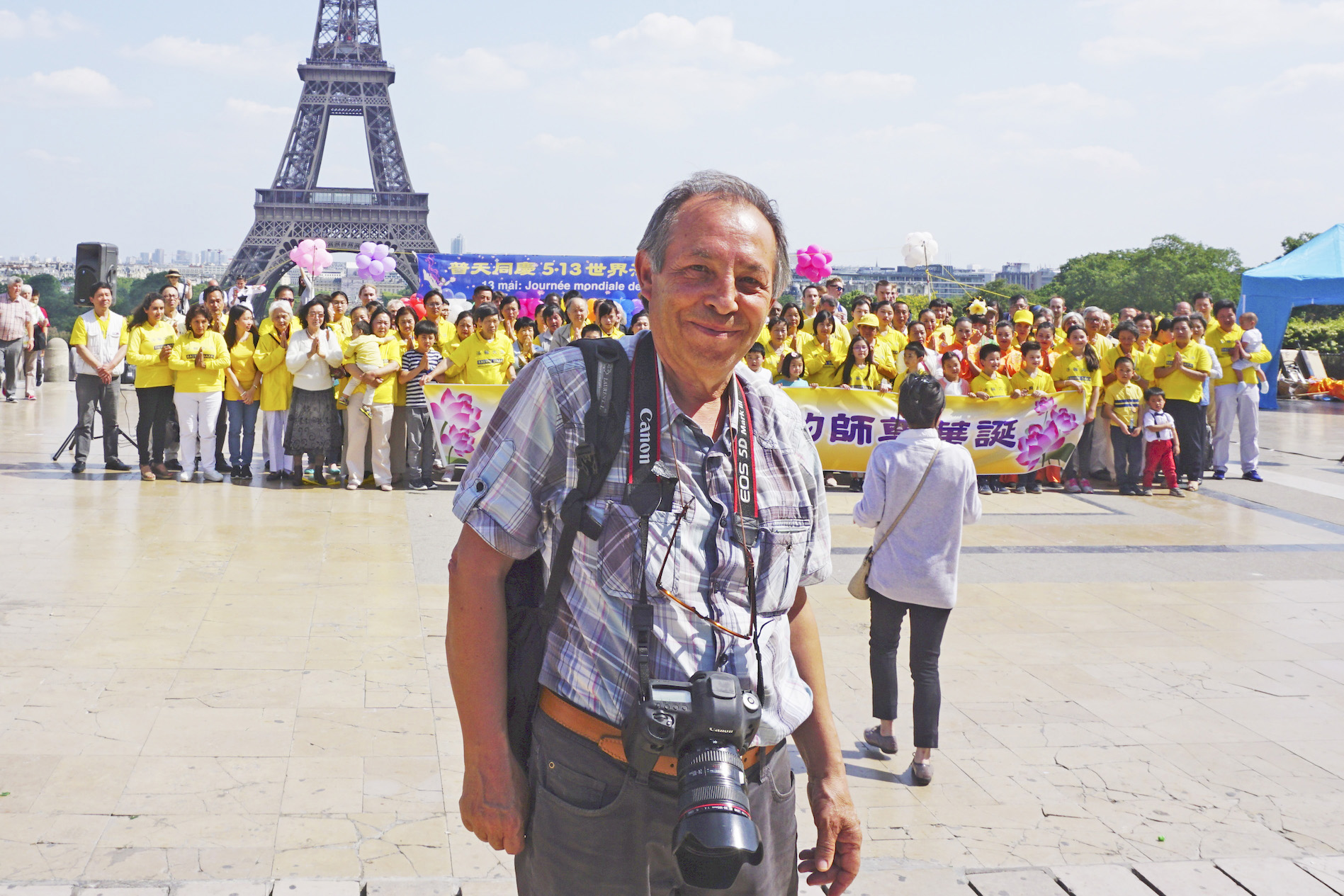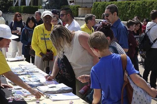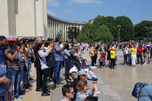 图3 :五月二十日,法国法轮功学员在法国巴黎人权广场庆祝法轮大法日,吸引过往的游客和法国民众驻足观看、拍照、摄像。