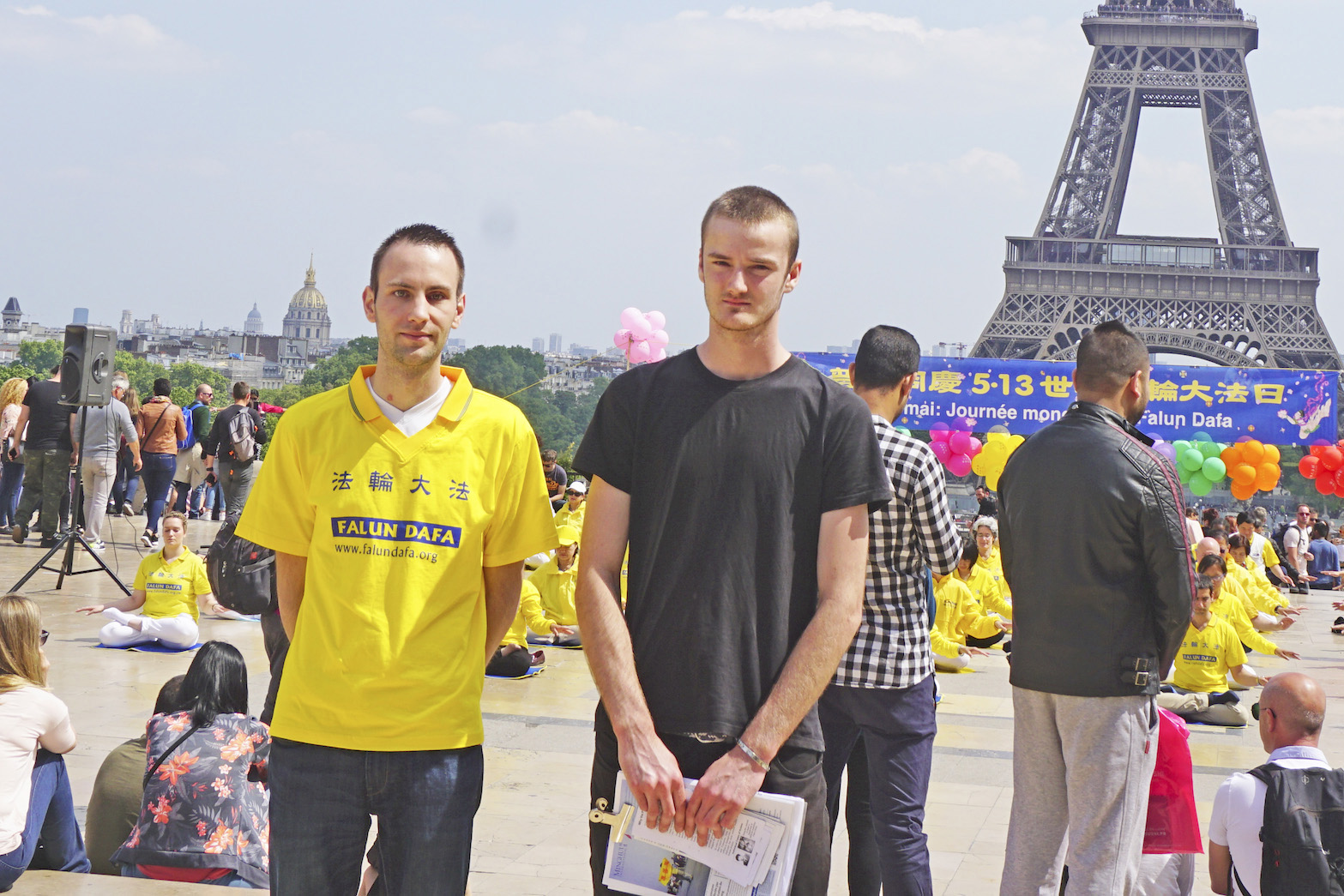 图15:法轮功学员吉佑姆(Guillaume)(左)和阿克赛尔(Axel)(右)表兄弟在巴黎人权广场参加庆祝世界法轮大法日活动。