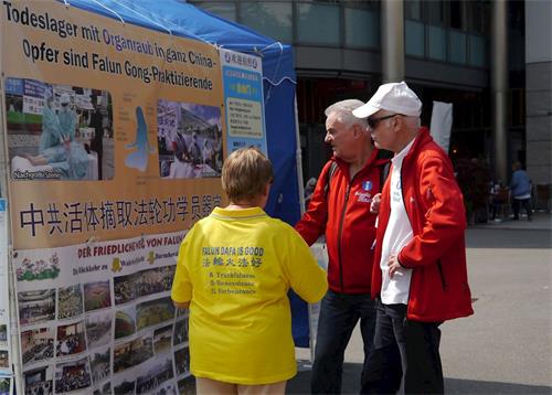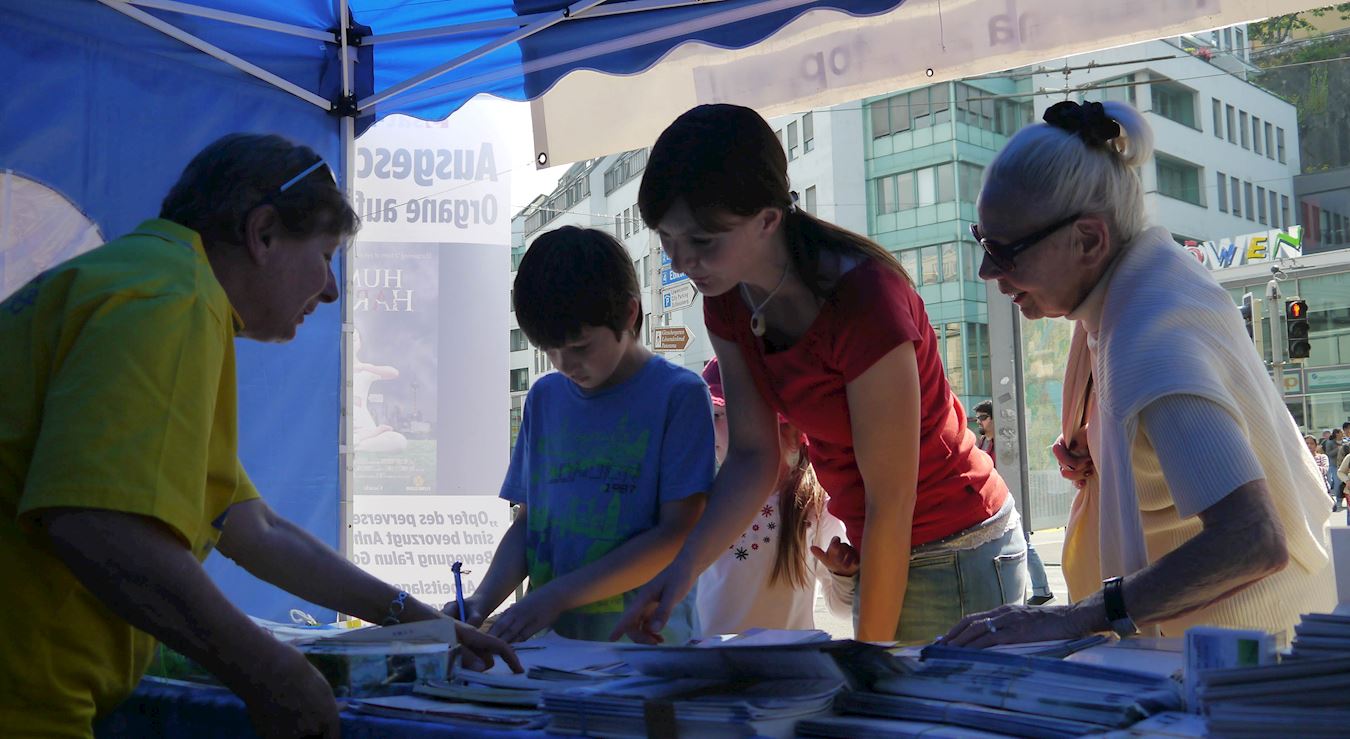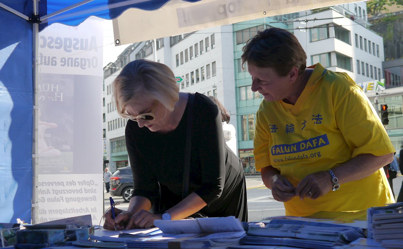 衣着得体的洛丁(Luedin)女士经常看到法轮功学员设立的信息摊位,但能有时间仔细阅读展板上的内容还是第一次。虽然她一般不在公众场合参与征签,但是在看了揭露中共活摘罪行的信息后,她立即签名要求制止这一罪行,并鼓励其他路人也签名表示支持。