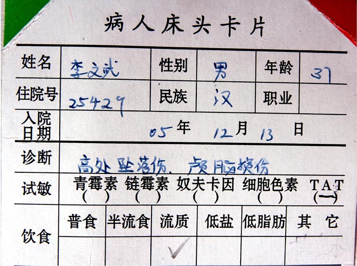 李强当晚被送到吉林市第二医院(肿瘤医院)脑颅科,图为李强在肿瘤医院住院的床头卡。据肿瘤医院的医务人员说:“人没事,头部上后面有一处有积水,腿、脚部位有擦伤,脚有损伤。”医务人员还说,“他神智清醒,没事儿,只是不和我们说话,现在不吃东西、不喝水。”医务人员没听他说过一句疼。