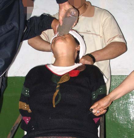 当时我被折磨得真是生不如死,那种呛心辣肺的痛苦无以言表。即使这样,那四个恶警仍每隔十五分钟便折磨我一次,他们把我的双手上下使劲抻来抻去的折磨,其中两个恶警用力抓住我的手,另一个恶警则使劲反复不停的往我的鼻子和嘴里灌辣根水。我的毛衣、毛裤、秋衣、秋裤全被汗水和辛辣的辣根水湿透了。
