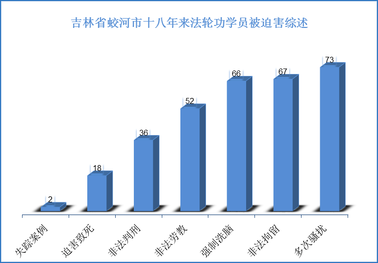 【明慧网二零一八年五月二十四日】(明慧网通讯员吉林报道)据明慧网报道不完全统计,自一九九九年七月江泽民流氓集团发动对法轮功的迫害以来,截止二零一七年十二月末,吉林省蛟河地区法轮功学员至少有18人遭迫害离世;2人失踪;36人被非法判刑;52人次被非法劳教;另有被绑架到洗脑班、拘留所、派出所折磨迫害的;被电话监控骚扰、敲门骚扰和骚扰家人等,几乎每个法轮功学员都遇到过。