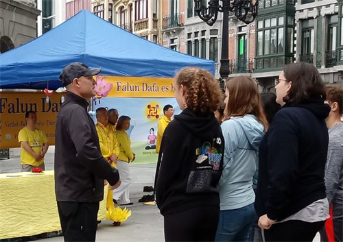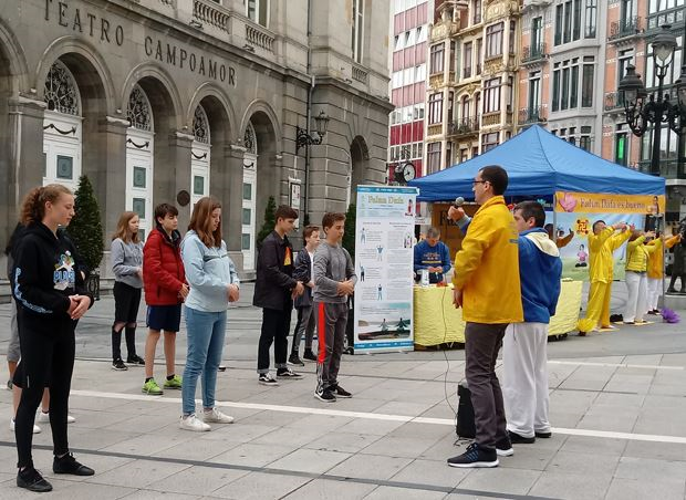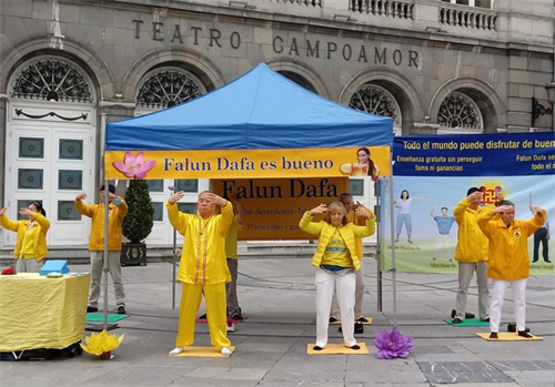法轮功学员们的到来为这里的人们带来了法轮大法的美好讯息。上午十点,法轮功学员们身着黄色炼功服来到奧維耶多市中心广场,展示法轮功五套优美舒缓的功法,悠扬的音乐吸引着一批批过往行人驻足观看,人们纷纷接过传单,拍照留念。
