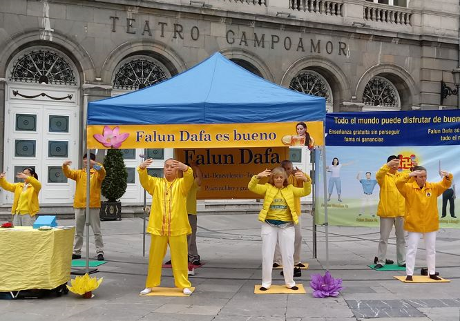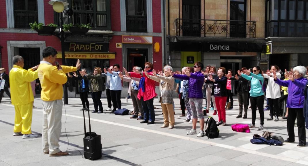 ![]() 图1~2:西班牙法轮功学员在奥维耶多(Oviedo)市中心广场演示法轮功功法 |