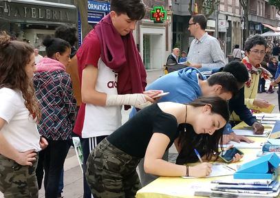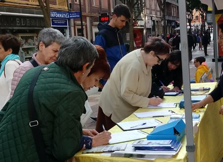 下午,法轮功学员在奥维耶多市最繁华商业区的中心地段举行了反迫害征签活动。人们在了解了法轮功真相,尤其是中共邪党活摘法轮功学员器官的残暴行径后非常震惊。一位来自巴西的女士接到传单后表示:活摘器官简直令人难以置信,这是人类的耻辱,她表示将会一直签名支持,直到迫害结束的那一天!临走前,她再三向法轮功学员表示感谢,谢谢他们传递真相。