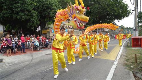 当地居民王文彬,之前骑了四小时的摩托车回到家乡的码头,在船上刚好遇上法轮功学员。得知法轮功学员正要前往邦咯岛举行游行,王文彬从游行一开始直到结束,他都站到游行队伍中来,帮忙分发资料给当地民众。在游行结束后,他也帮忙分发水给学员解渴。