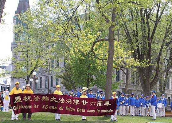 五月二十六日,加拿大法轮功学员在魁北克市,举行游行和集会活动,庆祝法轮大法弘传二十六周年,表达对李洪志师父的感恩。