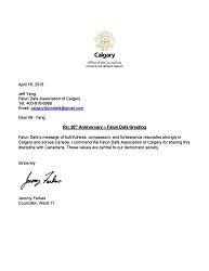2018年5月,法轮功学员庆祝大法洪传26周年之际,加拿大亚伯塔省(Alberta)各级政要纷纷发出贺信和褒奖,颂扬法轮大法“真、善、忍”的理念,并感谢法轮功学员多年来对社区所做出的卓越贡献。