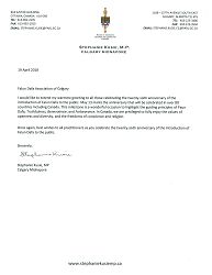 我谨代表Calgary-Skyview区,向法轮大法的所有成员致以崇高敬意,并祝他们在自强不息的道路上继续前行。”