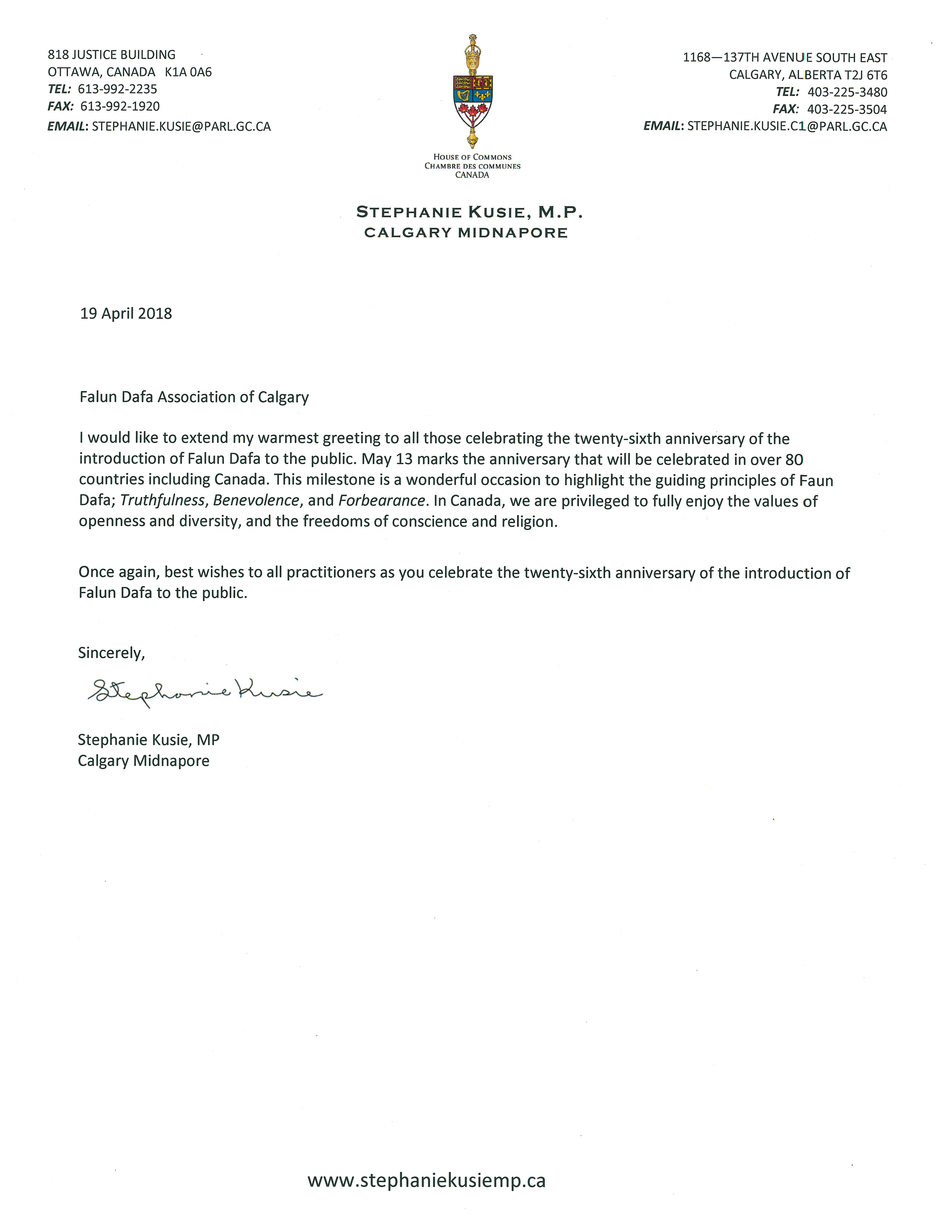 卡尔加里-Midnapore选区国会议员Stephanie Kusie在贺信中表示:“在此,我对法轮大法洪传于世26周年致以最热烈的祝贺。5月13日的庆典活动将在加拿大和全世界80多个国家举行。这个里程碑是弘扬法轮大法真、善、忍法则的美好时刻。在加拿大,我们全面享有开放的、多元化的价值观,以及良知和宗教信仰的自由。