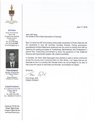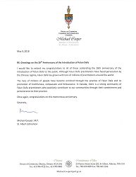 我对你们为人权自由和营救受迫害的法轮功修炼者所做出的努力表示尊敬。法轮功学员平静祥和,以真、善、忍为准则,为加拿大建立强大和自律的社区做出杰出的榜样。
