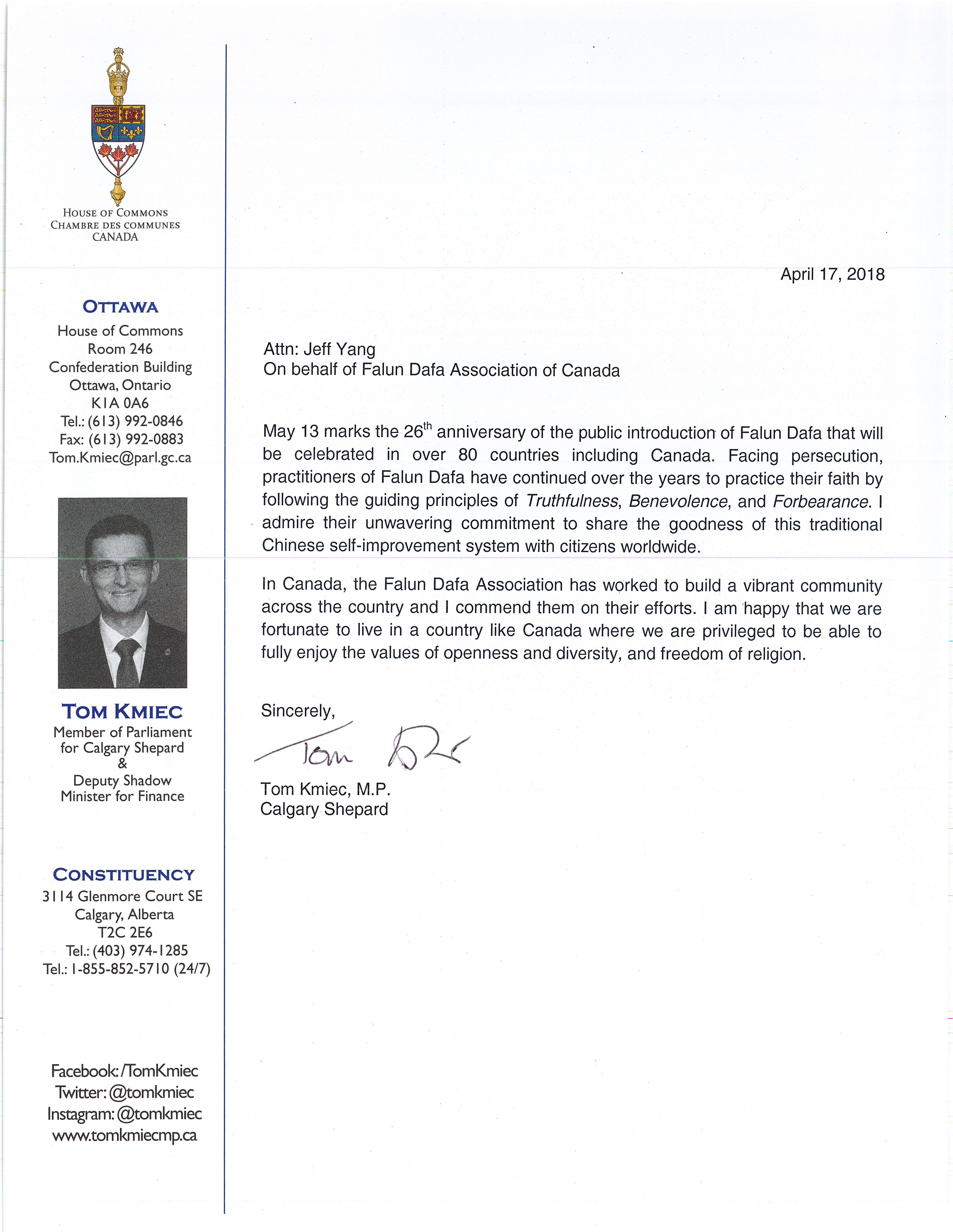 卡尔加里-Sheppard选区国会议员Tom Kmiec在贺信中表示:“今年的5月13日是法轮大法弘传世界26周年,加拿大将和世界80多个国家和地区的人们一起庆祝这一节日。面对非法迫害,法轮大法修炼者仍坚守着自己的信仰,遵循着修炼原则:真、善、忍。对你们如此坚定不移的向全世界推广中国传统的自我完善的修炼功法,我表示十分钦佩。