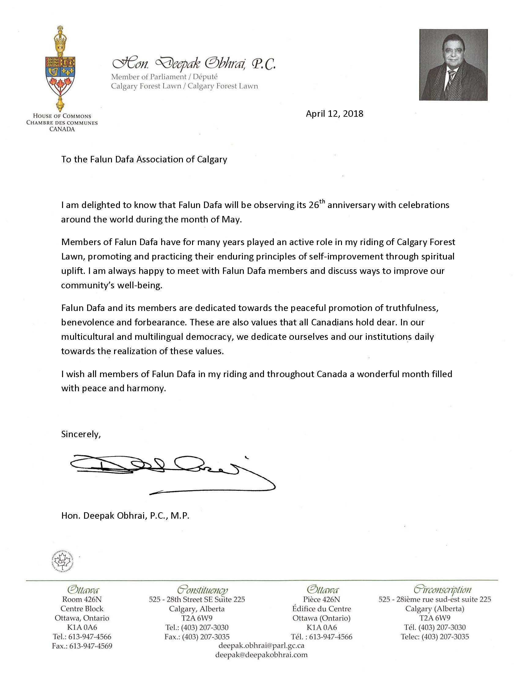 卡尔加里-Forest Lawn选区国会议员Deepak Obhrai在贺信中表示:“我很高兴的得知,法轮大法将于5月份在全世界举行26周年庆典。