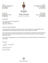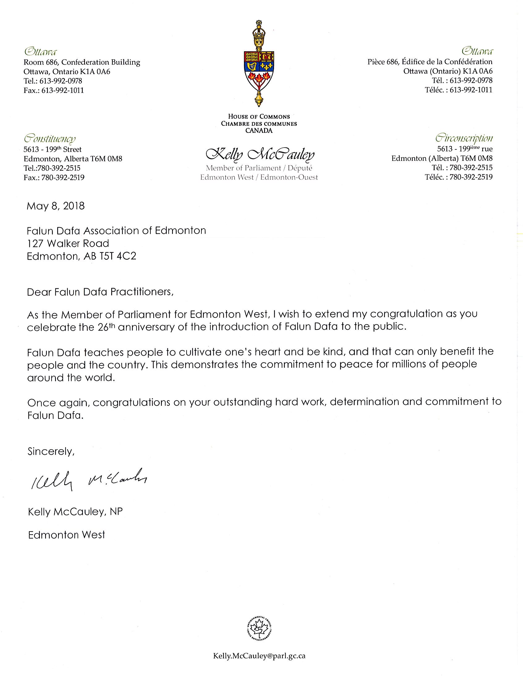 埃德蒙顿西区国会议员Kelly McCauley在贺信中表示:“作为埃德蒙顿西区国会议员,我祝贺你们庆祝法轮大法洪传26周年。