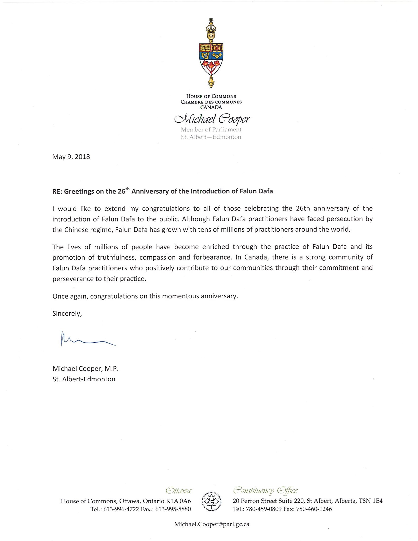 埃德蒙顿-圣阿尔伯特国会议员Michael Cooper在贺信中表示:“我祝贺所有庆祝法轮大法洪传26周年的人们。尽管法轮大法修炼者面对中共的迫害,法轮大法修炼者人数仍在世界上以千万记的增长。