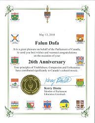 法轮大法通过静坐功法和传统佛家思想帮助人们从精神、心理、道德和身体方面改善他们的生活。法轮大法以真、善、忍为指导原则,突出体现了加拿大多元化、开放和和平的社会价值。我赞扬其持续为丰富加拿大社会的结构作出的贡献。