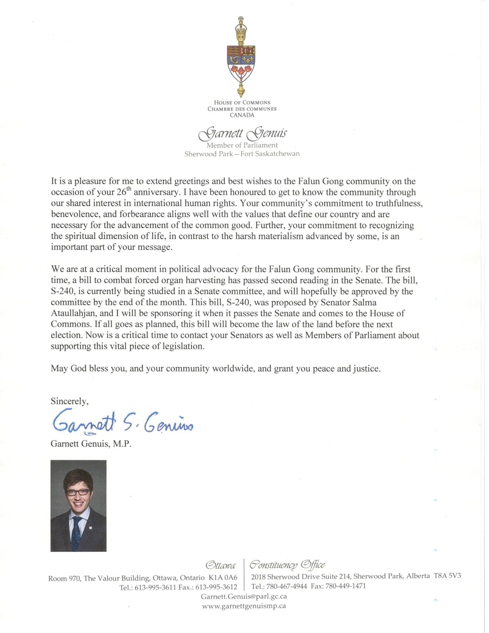 Fort Saskatchewan-Sherwood Park选区国会议员Garnett Genuis在贺信中表示:“我很高兴在法轮大法洪传26周年之际向法轮功团体致以问候和良好的祝愿。 我很荣幸能通过我们对国际人权的共同关注而了解这个团体。你们遵循的真、善、忍原则与我们国家的价值观是一致的,也是促进共同利益的必要条件。此外,与某些人所主张的苛刻的唯物主义相反,你们对认知生命精神层面的承诺是你们信息的重要组成部分。